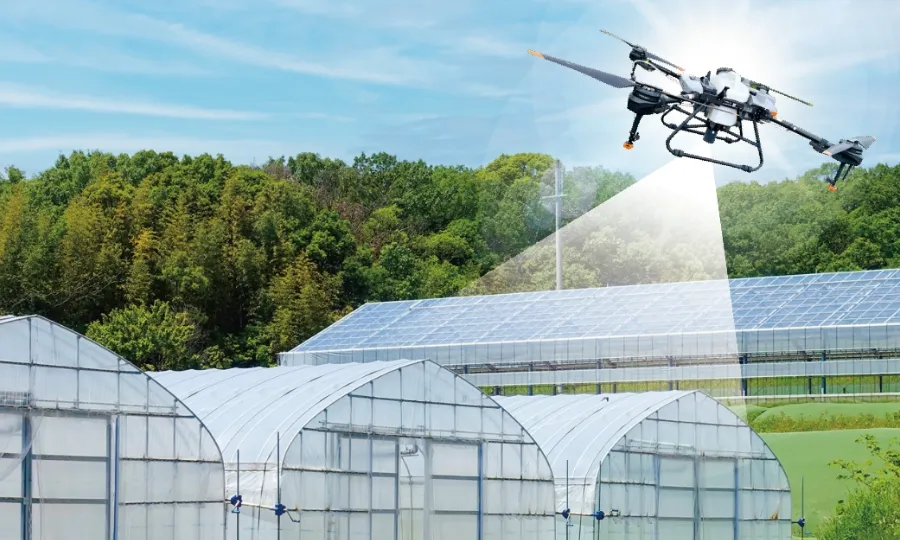 ドローンにより、簡単にハウスの天井へ専用遮熱塗料を吹付できます。